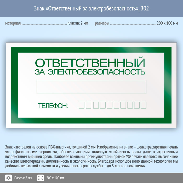 Знак «Ответственный за электробезопасность», B02 (пластик, 200х100 мм) в Улан-Удэ купить