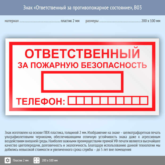 Знак «Ответственный за пожарную безопасность», B03 (пластик, 200х100 мм) в Улан-Удэ купить