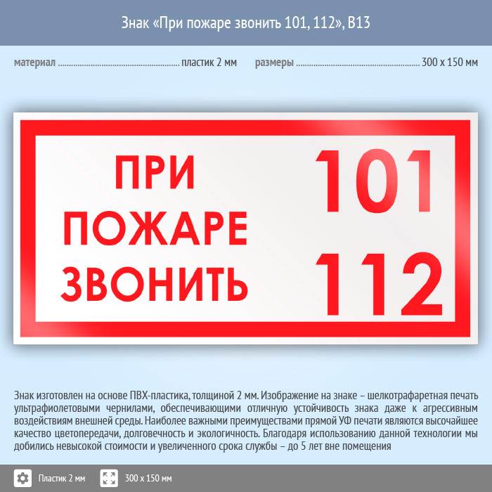 Знак «При пожаре звонить 101, 112», B13 (пластик, 300х150 мм) в Улан-Удэ купить