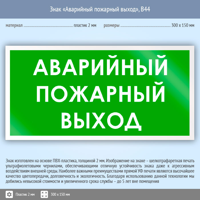 Знак «Аварийный пожарный выход», B44 (пластик, 300х150 мм) в Улан-Удэ купить