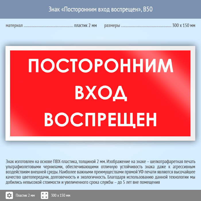Знак «Посторонним вход воспрещен», B50 (пластик, 300х150 мм) в Улан-Удэ купить