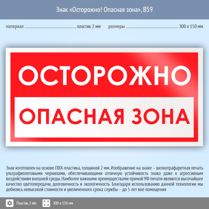 Знак «Осторожно! Опасная зона», B59 (пластик, 300х150 мм) в Улан-Удэ купить