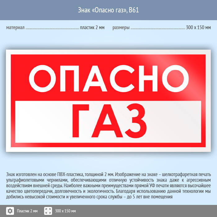 Знак «Опасно газ», B61 (пластик, 300х150 мм) в Улан-Удэ купить