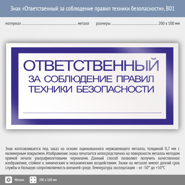 Знак «Ответственный за соблюдение правил техники безопасности», B01 (металл, 200х100 мм) в Улан-Удэ купить