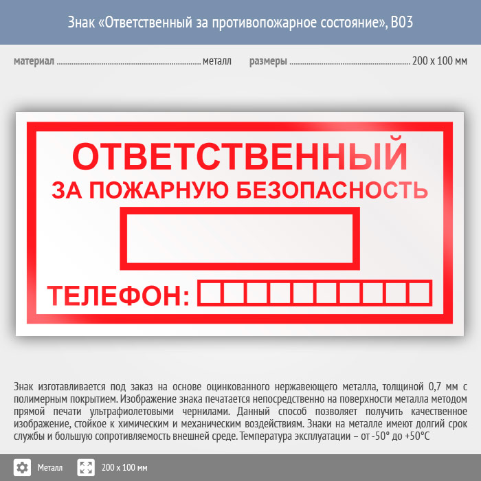 Знак «Ответственный за пожарную безопасность», B03 (металл, 200х100 мм) в Улан-Удэ купить