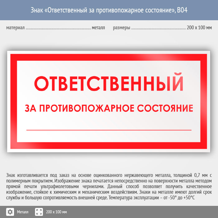 Знак «Ответственный за противопожарное состояние», B04 (металл, 200х100 мм) в Улан-Удэ купить