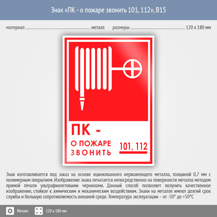 Знак «ПК - о пожаре звонить 101, 112», B15 (металл, 120х180 мм) в Улан-Удэ купить