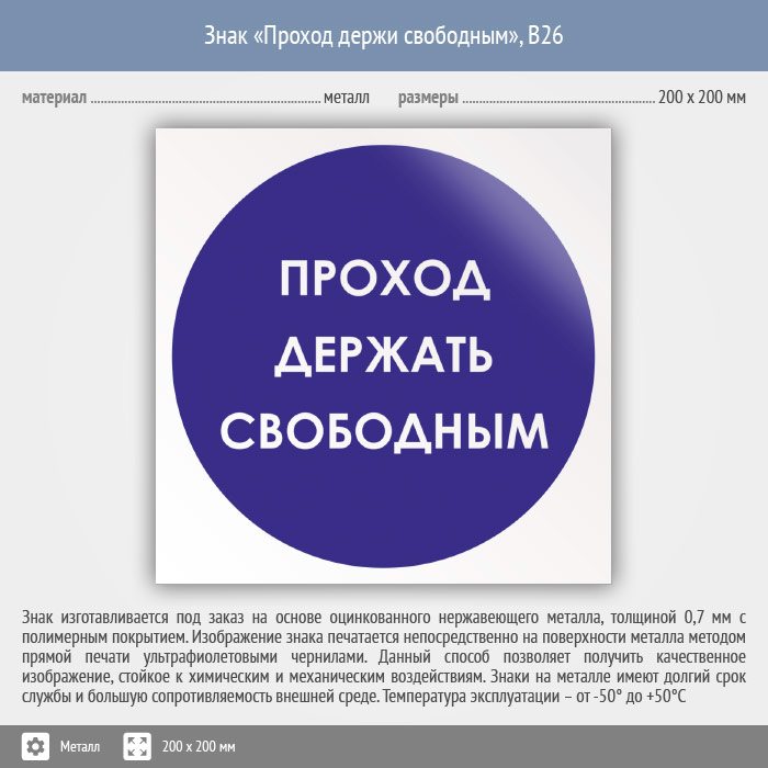 Знак «Проход держи свободным», B26 (металл, 200х200 мм) в Улан-Удэ купить