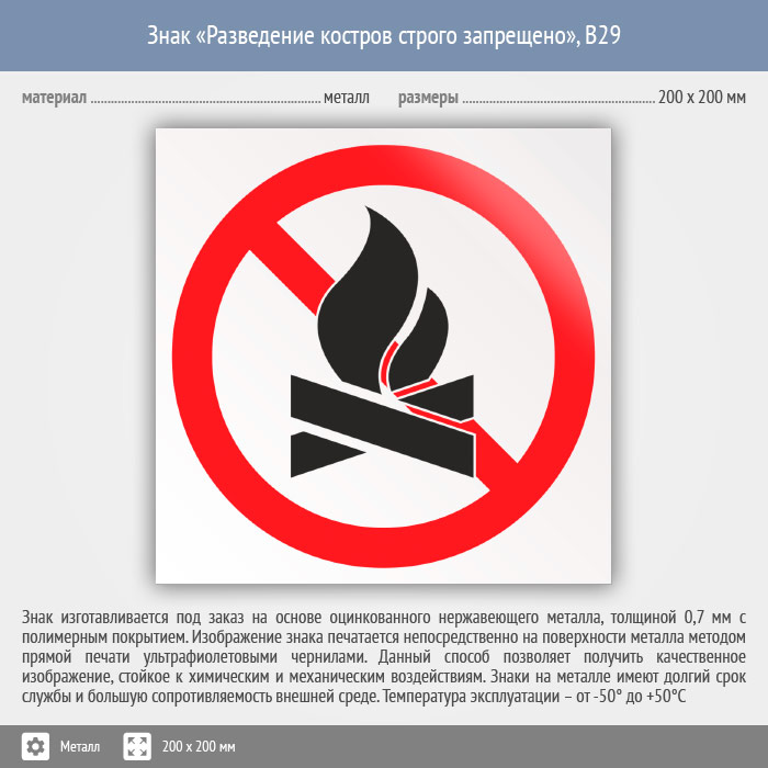 Знак «Разведение костров строго запрещено», B29 (металл, 200х200 мм) в Улан-Удэ купить