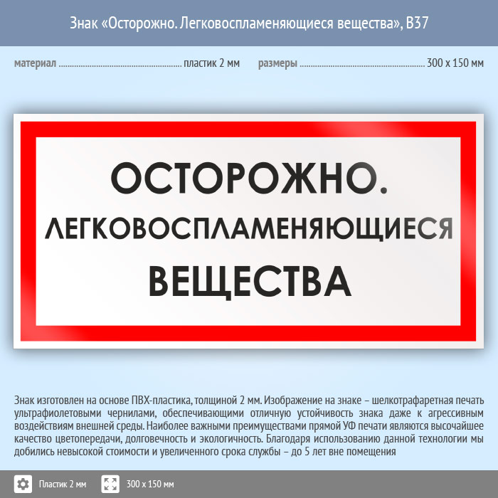 Знак «Осторожно. Легковоспламеняющиеся вещества», B37 (пластик, 300х150 мм) в Улан-Удэ купить