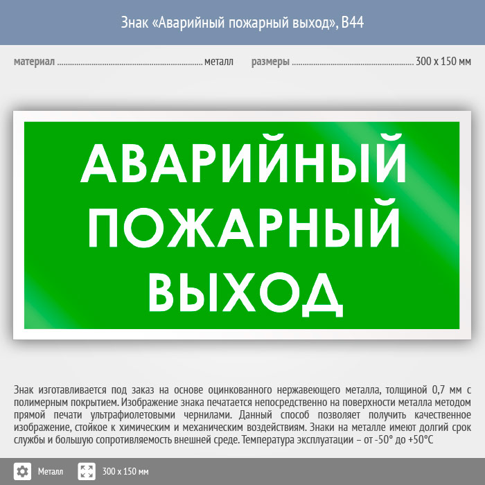 Знак «Аварийный пожарный выход», B44 (металл, 300х150 мм) в Улан-Удэ купить