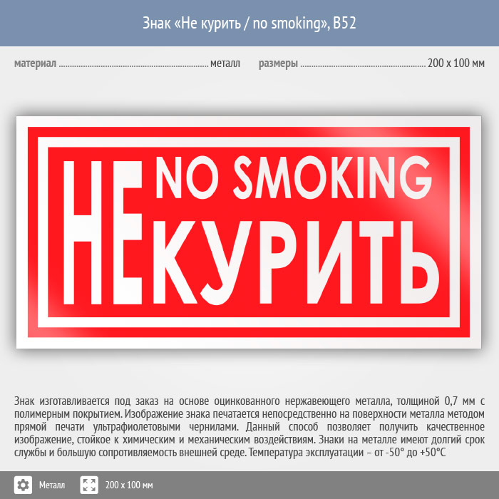 Знак «Не курить / no smoking», B52 (металл, 200х100 мм) в Улан-Удэ купить