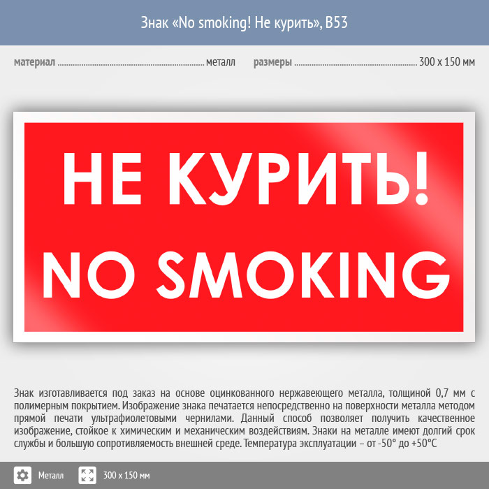 Знак «No smoking! Не курить», B53 (металл, 300х150 мм) в Улан-Удэ купить