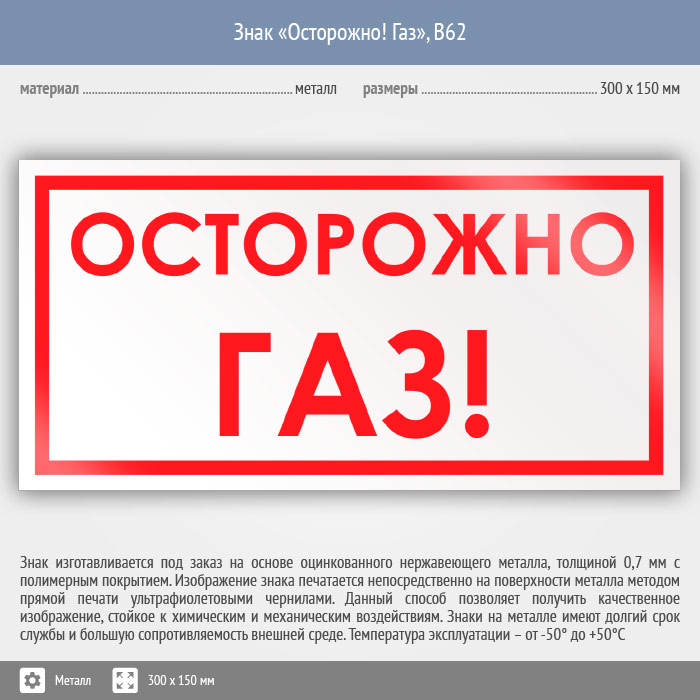 Знак «Осторожно! Газ», B62 (металл, 300х150 мм) в Улан-Удэ купить