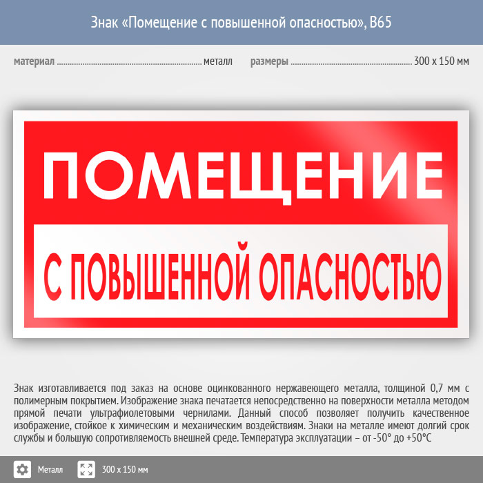 Знак «Помещение с повышенной опасностью», B65 (металл, 300х150 мм) в Улан-Удэ купить