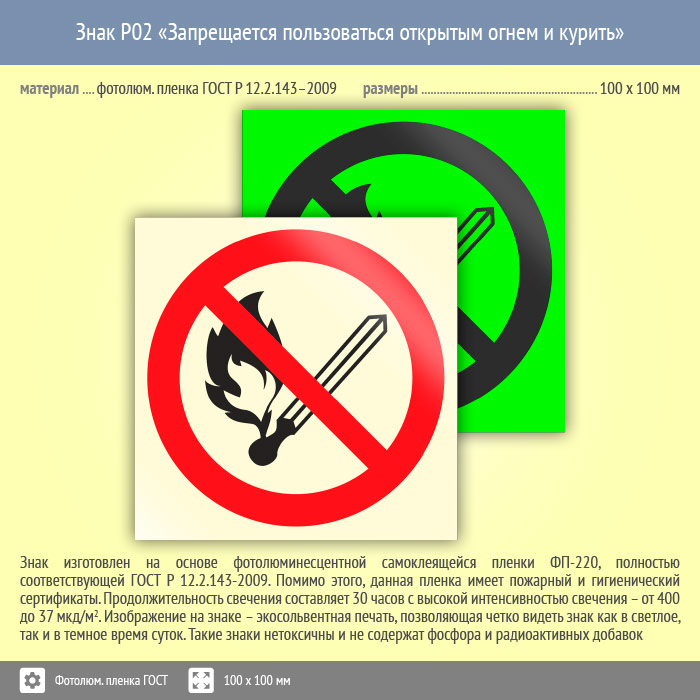 Знак P02 «Запрещается пользоваться открытым огнем и курить» (фотолюминесцентная пленка ГОСТ 34428-2018, 100х100 мм) в Улан-Удэ купить