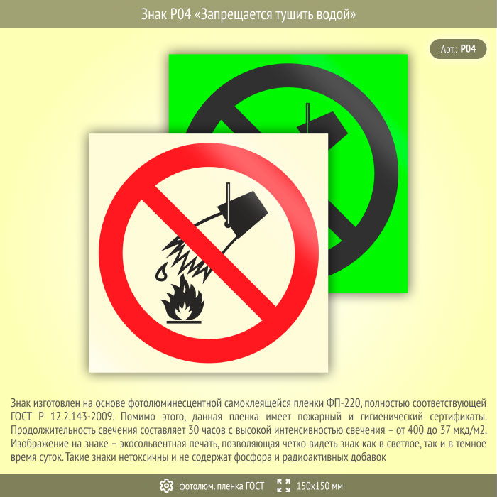 Знак P04 «Запрещается тушить водой» (фотолюминесцентная пленка ГОСТ 34428-2018, 150х150 мм) в Улан-Удэ купить