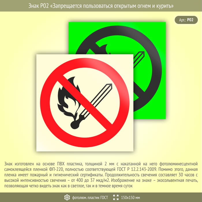 Знак P02 «Запрещается пользоваться открытым огнем и курить» (фотолюминесцентный пластик ГОСТ 34428-2018, 150х150 мм) в Улан-Удэ купить