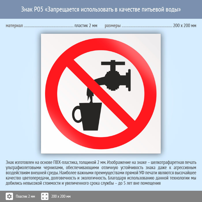Знак P05 «Запрещается использовать в качестве питьевой воды» (пластик, 200х200 мм) в Улан-Удэ купить