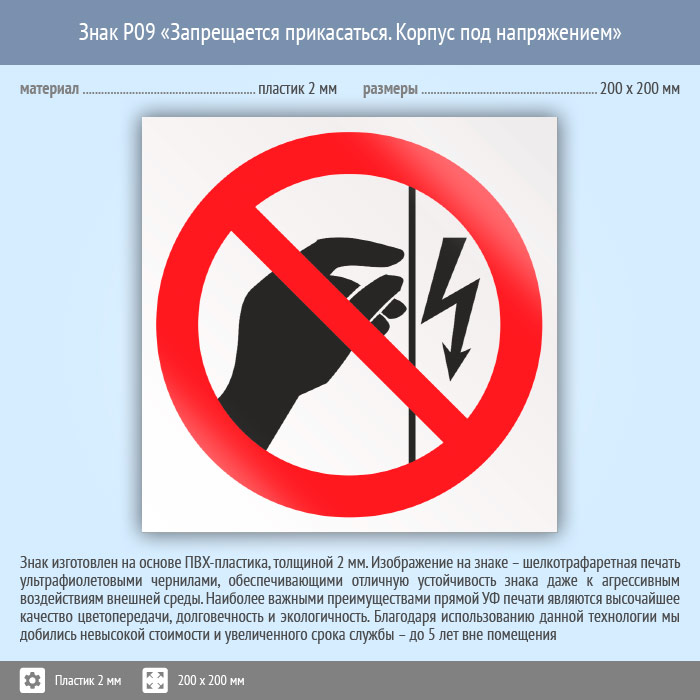 Знак P09 «Запрещается прикасаться. Корпус под напряжением» (пластик, 200х200 мм) в Улан-Удэ купить