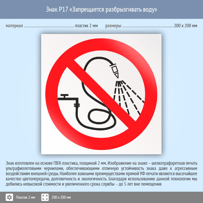 Знак P17 «Запрещается разбрызгивать воду» (пластик, 200х200 мм) в Улан-Удэ купить