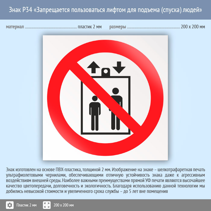 Знак P34 «Запрещается пользоваться лифтом для подъема (спуска) людей» (пластик, 200х200 мм) в Улан-Удэ купить