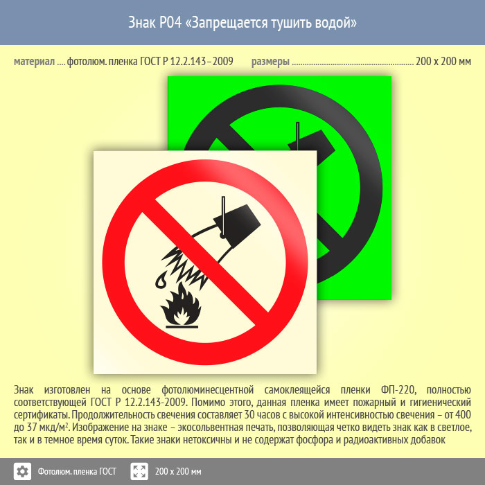 Знак P04 «Запрещается тушить водой» (фотолюминесцентная пленка ГОСТ 34428-2018, 200х200 мм) в Улан-Удэ купить