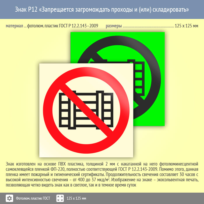 Знак P12 «Запрещается загромождать проходы и (или) складировать» (фотолюминесцентный пластик ГОСТ 34428-2018, 125х125 мм) в Улан-Удэ купить