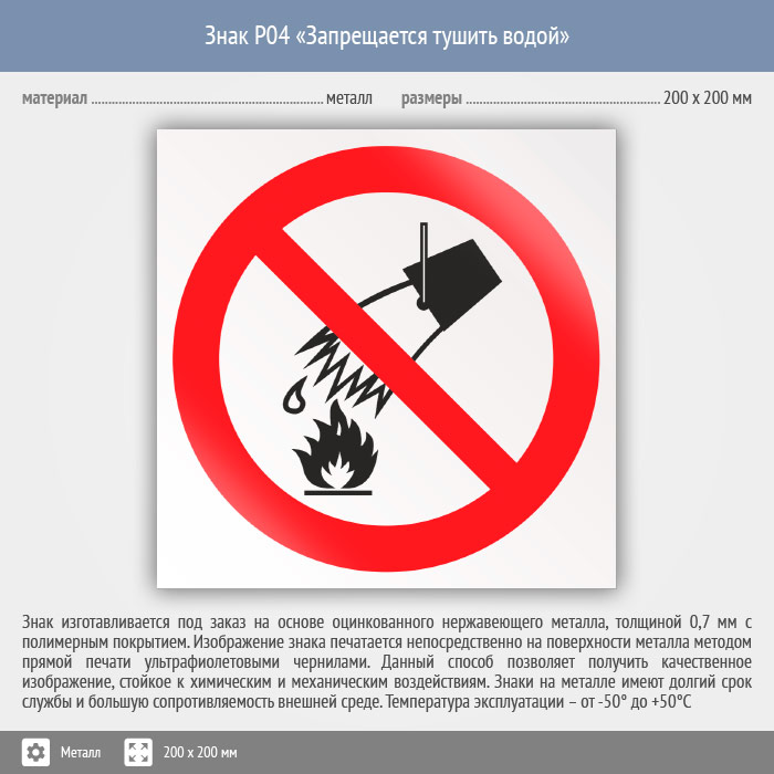 Знак P04 «Запрещается тушить водой» (металл, 200х200 мм) в Улан-Удэ купить