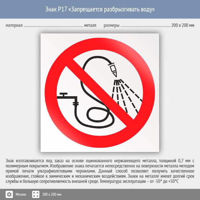 Знак P17 «Запрещается разбрызгивать воду» (металл, 200х200 мм) в Улан-Удэ купить