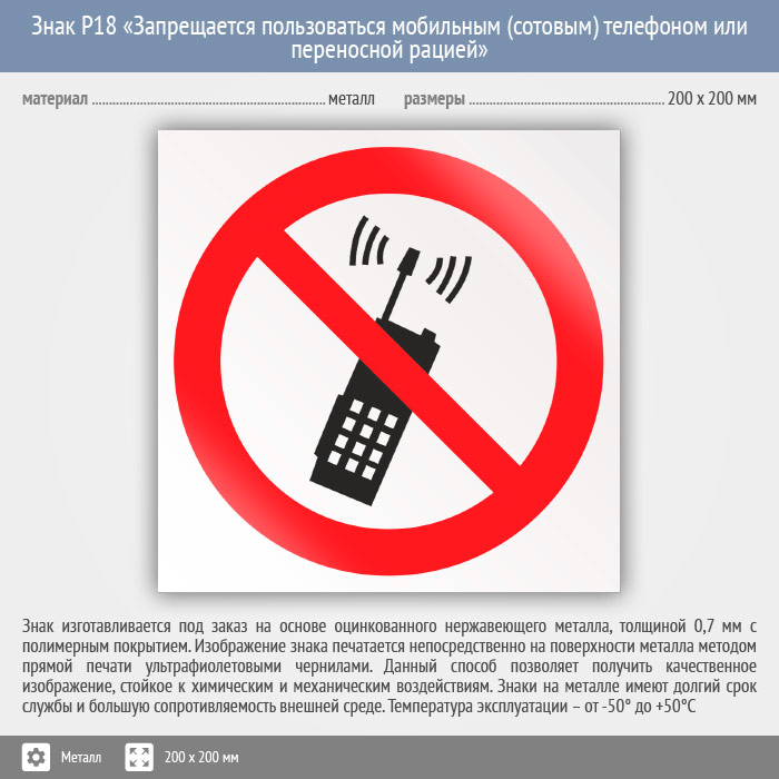 Знак P18 «Запрещается пользоваться мобильным (сотовым) телефоном или переносной рацией» (металл, 200х200 мм) в Улан-Удэ купить