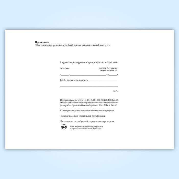 Вы получаете печатную продукцию прошнурованной и c местом для вашей печати в соответствии с действующими нормативными документами: