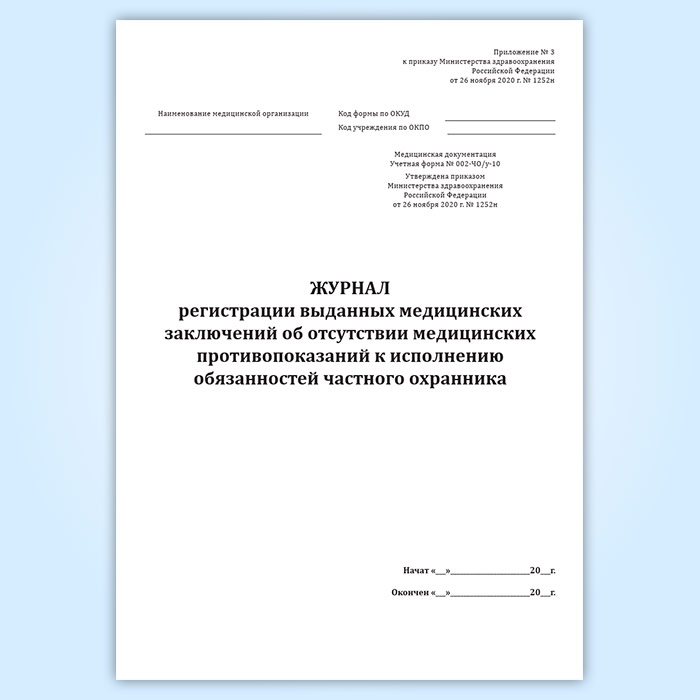 Журнал регистрации выданных медицинских заключений об отсутствии медицинских противопоказаний к исполнению обязанностей частного охранника (учетная форма № 002-ЧО/у-10) в Улан-Удэ купить