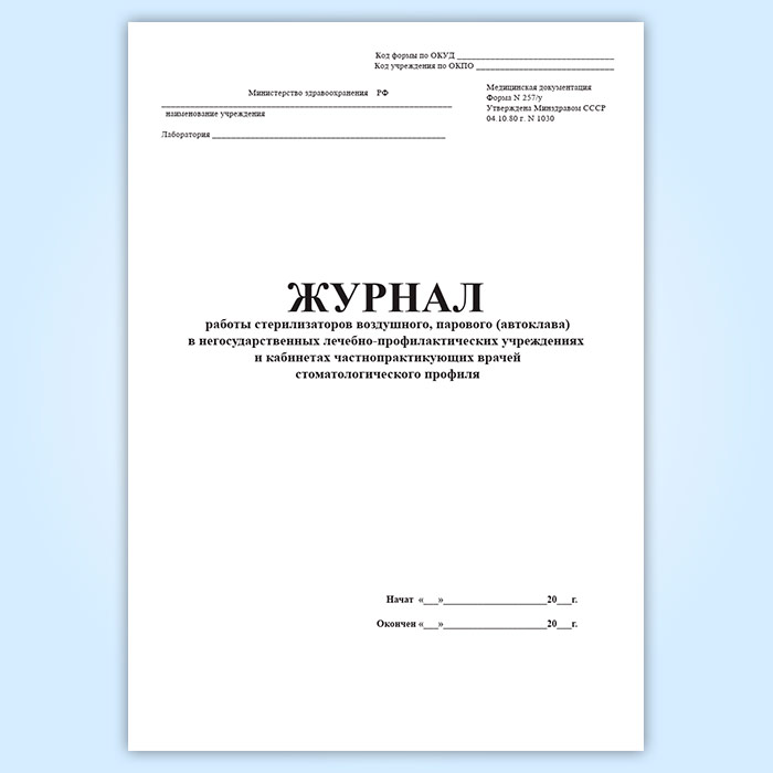 Журнал работы стерилизаторов воздушного, парового (автоклава) в негосударственных лечебно-профилактических учреждениях и кабинетах частнопрактикующих врачей стоматологического профиля (форма 257/у) в Улан-Удэ купить
