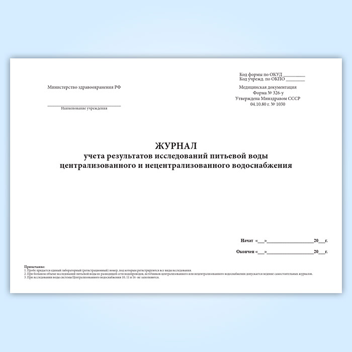 Журнал учета результатов исследований питьевой воды централизованного и нецентрализованного водоснабжения (форма 326-у) в Улан-Удэ купить