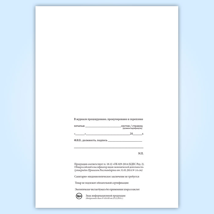 Вы получаете печатную продукцию прошнурованной и c местом для вашей печати в соответствии с действующими нормативными документами: