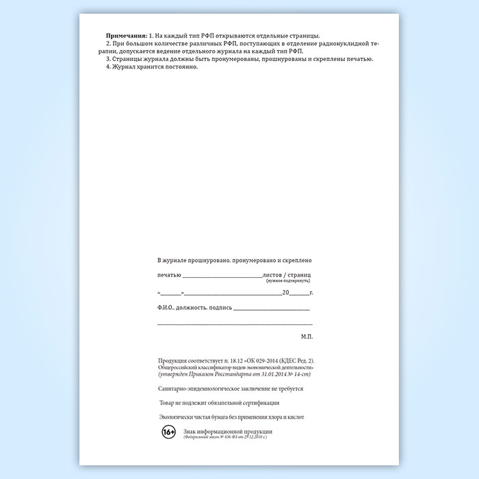 Приходно-расходный журнал учета радиофармпрепаратов, поступающих в подразделение радионуклидной терапии в готовом виде для непосредственного введения в организм пациента в Улан-Удэ купить