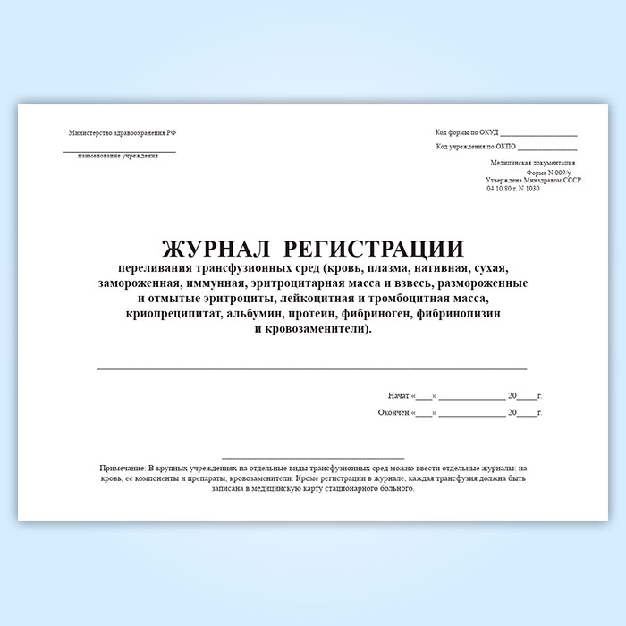 Журнал регистрации переливания трансфузионных сред (форма 009/у) в Улан-Удэ купить