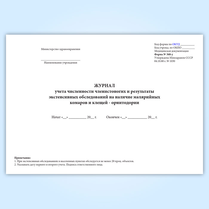 Журнал учета численности членистоногих и результаты экстенсивных обследований на наличие малярийных комаров и клещей - орнитодории (форма № 368-у) в Улан-Удэ купить