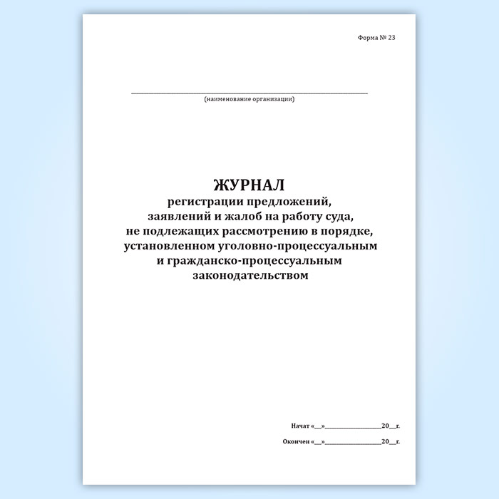 Журнал регистрации предложений, заявлений и жалоб на работу суда, не подлежащих рассмотрению в порядке, установленном уголовно-процессуальным и гражданско-процессуальным законодательством (форма № 23) в Улан-Удэ купить