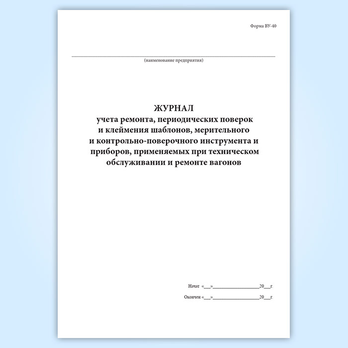 Журнал учета ремонта, периодических поверок и клеймения шаблонов, мерительного и контрольно-поверочного инструмента и приборов, применяемых при техническом обслуживании и ремонте вагонов (форма ВУ-40) в Улан-Удэ купить
