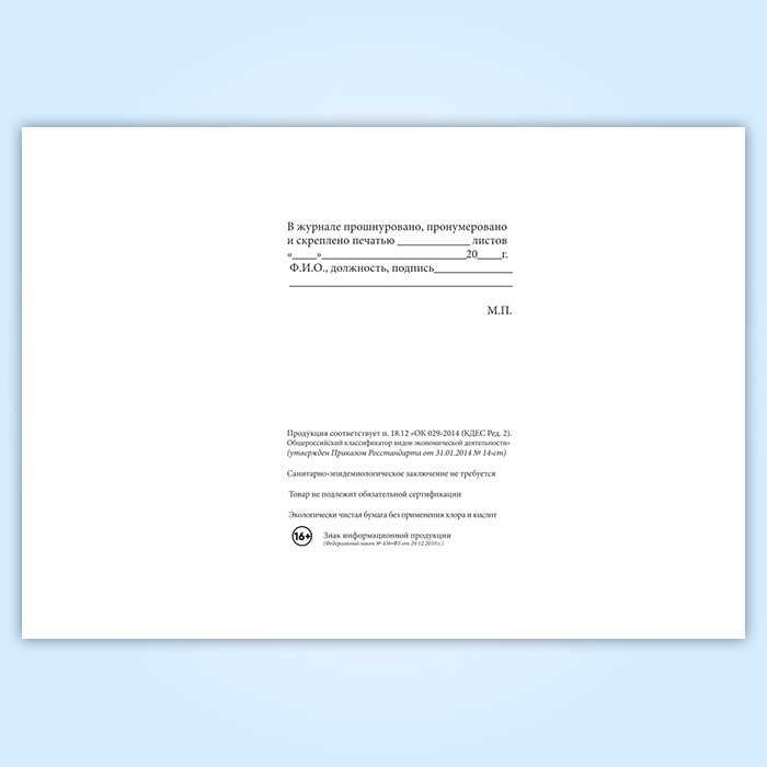 Вы получаете печатную продукцию прошнурованной и c местом для вашей печати в соответствии с действующими нормативными документами: