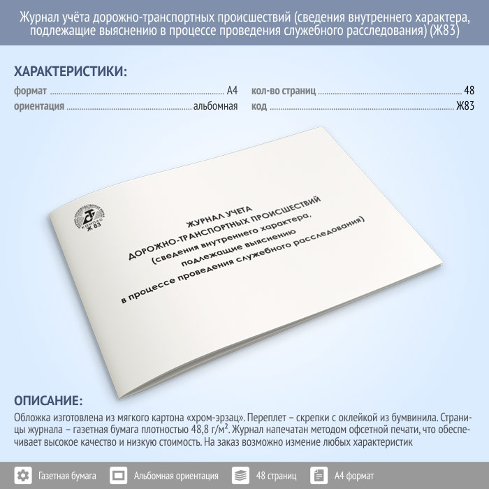 Журнал учета дорожно-транспортных происшествий (сведения внутреннего характера, подлежащие выяснению в процессе проведения служебного расследования) (48 стр., Ж83) в Улан-Удэ купить