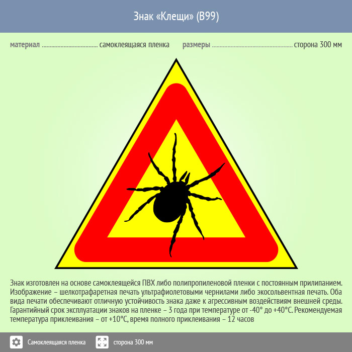 Знак «Клещи», B99 изготавливается в 2-х типоразмерах - сторона 200 мм и сторона 300 мм, но также может быть изготовлен любого размера на самоклеящейся пленке с ламинированием и без, пластике толщиной 0.5, 2 или 4 мм и металле. Также возможно применение фотолюминесцентных и световозвращающих материалов