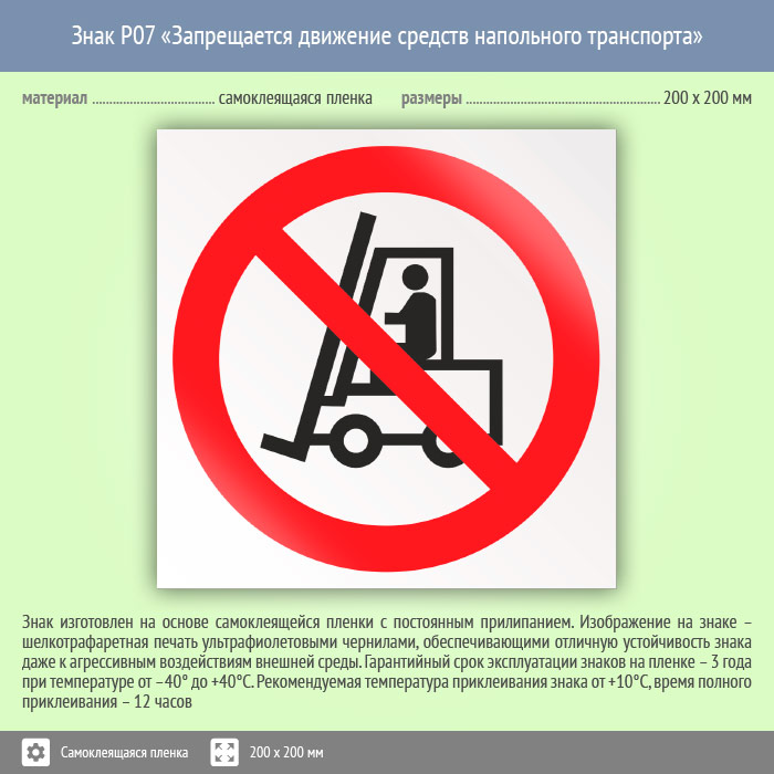 Знак «Запрещается движение средств напольного транспорта» имеет размер 200х200 мм