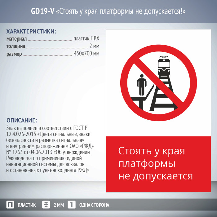 Знак безопасности «Стоять у края платформы не допускается!» выполняется в одностороннем (металл и пластик) и двустороннем (только металл) виде на ПВХ-пластике, толщиной 2 мм или на листе оцинкованного металла, толщиной 0,8 мм. Размеры знаков - 450 мм х 700 мм (вертикальная ориентация) либо 540 мм х 220 мм (горизонтальная ориентация). Знаки изготавливаются в полном соответствии с ГОСТ Р 12.4.026-2015 «Цвета сигнальные, знаки безопасности и разметка сигнальная» и внутренним распоряжением ОАО «РЖД» № 1263 от 04.06.2013 «Об утверждении Руководства по применению единой навигационной системы для вокзалов и остановочных пунктов холдинга РЖД». По желанию заказчика возможно использование светоотражающих материалов. Так же при необходимости производим закругление углов знака