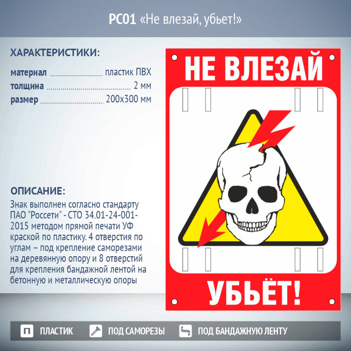 Знак «Не влезай, убьет!», РС01 (пластик 2 мм, 200х300 мм, отверстия под бандажную ленту) в Улан-Удэ купить