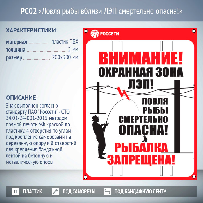 Знак «Ловля рыбы вблизи ЛЭП смертельно опасна!», РС02 (пластик 2 мм, 200х300 мм, отверстия под бандажную ленту) в Улан-Удэ купить