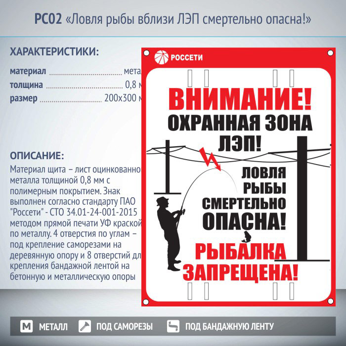 Знак «Ловля рыбы вблизи ЛЭП смертельно опасна!», РС02 (металл, 200х300 мм, отверстия под бандажную ленту) в Улан-Удэ купить