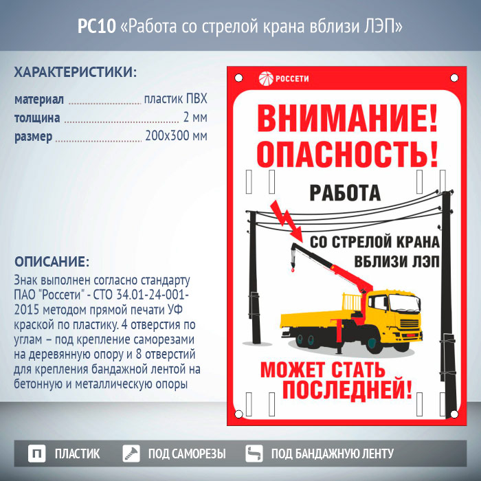 Знак «Работа со стрелой крана вблизи ЛЭП», РС10 (пластик 2 мм, 200х300 мм, отверстия под бандажную ленту) в Улан-Удэ купить